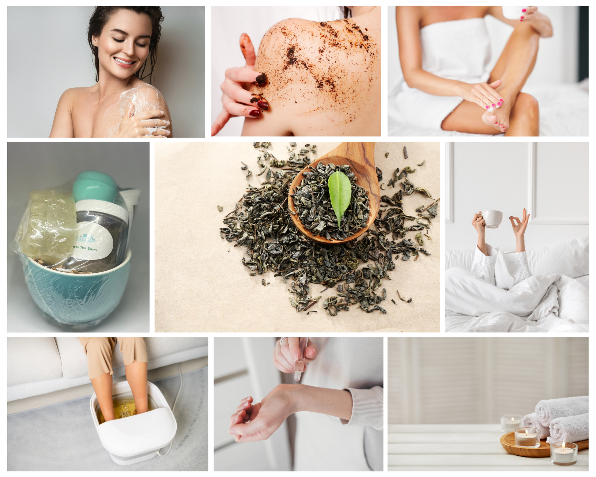Massage out those aches & pain with the lemongrass soap. Exfoliate with the luxurious body scrub. Moisturize with matcha. Titillate your senses with aromatherapy oils. Soak your troubles away with bath tea. Enjoy the mug with drinking tea that compliments the body scrub.
